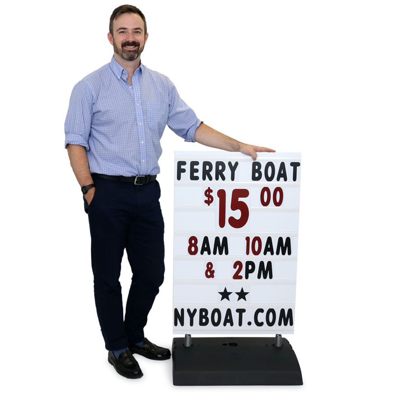 Economically priced when compared to other sidewalk signs, the Springer makes advertising simpler than ever! The quick and easy to change message board provides a sure-fire way to convey sales, deals and bargains daily. Comes with a customizable message board allowing you to create range of advertisements, messages or a sales pitch. The anti-slip feet keep the sign holder firmly in place when on the sidewalk. Heavy-duty springs keep the sign in place in 40+ mph winds! For added stability in windy conditions fill the ballast port (located in the middle base) with water or sand. Comes with a large assortment of letters, numbers and symbols, please see contents for details. All components are made in the USA and offer superior quality to the imported knock-offs sold by most competitors. You can purchase extra numbers for this kit by clicking here. Includes one 22" x 24" x 5" Economy Springer Sign Base, two no-slide feet, and one set of assembly hardware. The DELUXE version comes with one - 24" x 36" x 0.5" (600 x 900 x 10mm) white message board with 7 letter tracks on both sides, one set of 314 - 4" letters, numbers, and symbols (black letters & red numbers), two - 8" double-sided headers (Sale/Special in red), and one set of 22 - jumbo 8" numbers with the percent symbol (red).