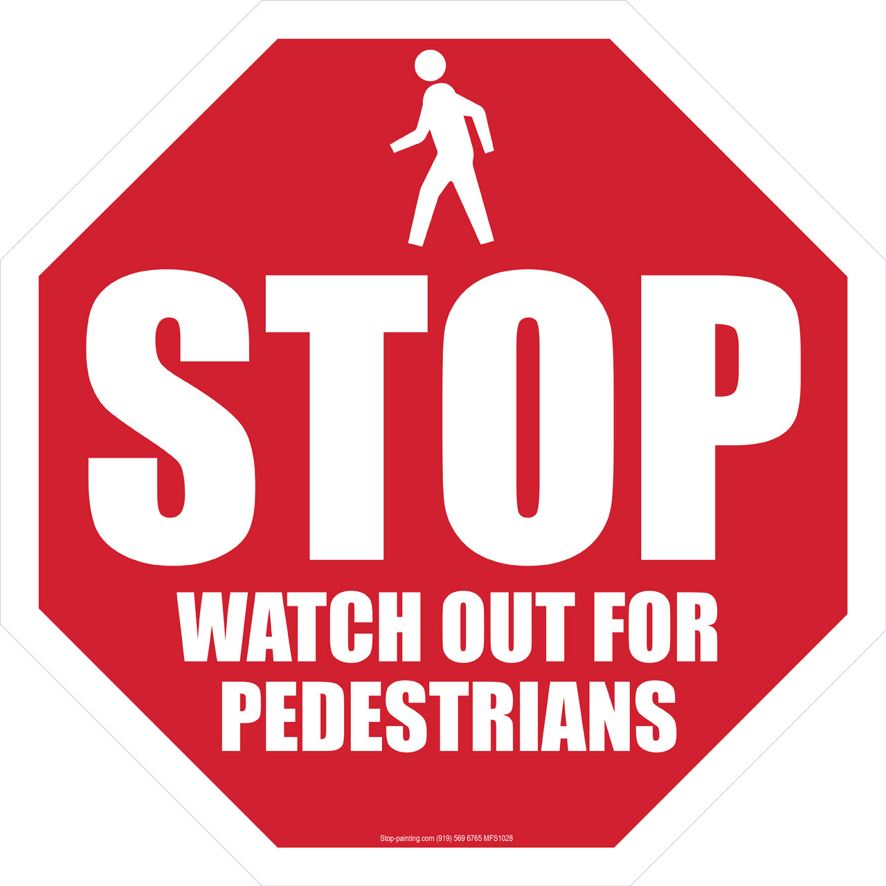 Keeping employees safe with a STOP Watch for Pedestrians 18 in. octagon floor sign is efficient and effective. Choose vinyl, rubber, or inlaid mesh. Reminding everyone to watch out for pedestrian traffic on busy industrial facility floors not only increases safety rates, but productivity rates as well. Visual cues like our adhesive floor signs make sure pedestrian routes are clearly marked and serve as reminders for all to strive to keep pedestrians safe in busy facilities. Use this floor sign wherever pedestrians are expected to travel and where mobile equipment, like forklifts or mobile pallet jacks, should take special care.